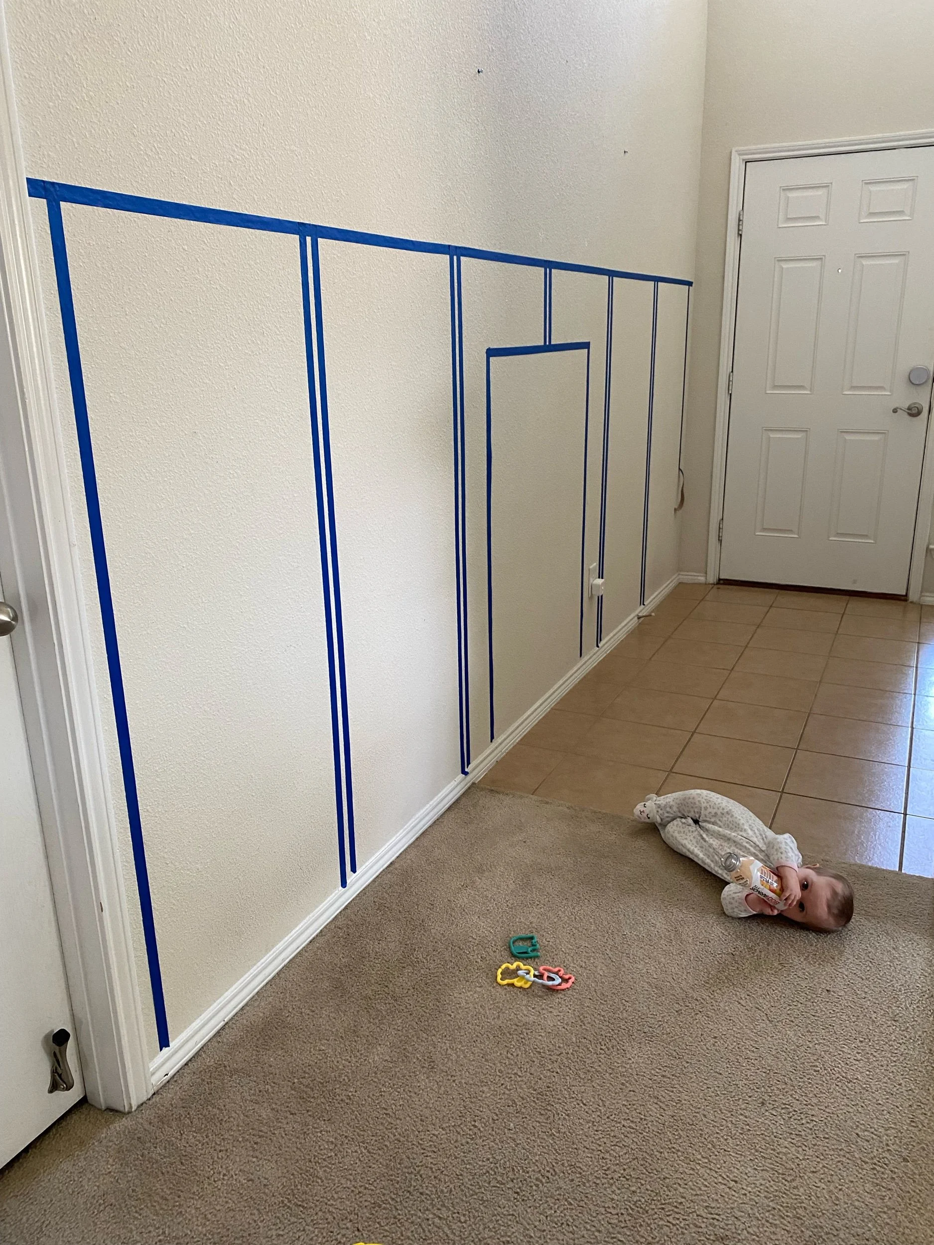 The board and batten feature in our entry way was one of the first projects I tackled in our new home. The space was long and relatively wide and COMPLETELY bare. When trying to explain to Chris exactly what I wanted to do, he had no idea what I was talking about. So, I took out some painters tape and put it up on the wall. I marked out where each batten would go, how tall they would be and even marked out where I wanted to put a shoe cabinet. At the time, we had no place to place our shoes, so we often found them in our baby’s mouth (*cringe). So shoe storage was a top priority for me!